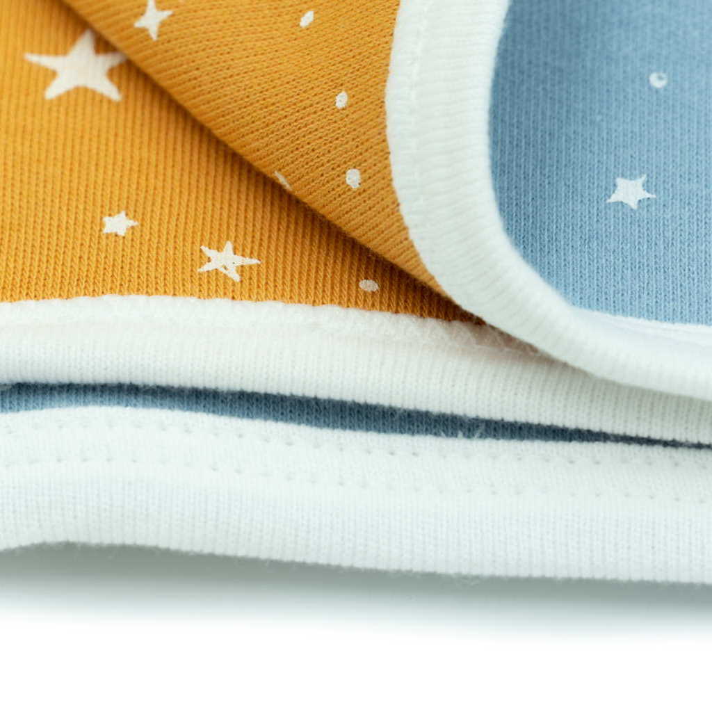 The Little Aviator Blanket features two prominent colors. One side is blue with white stars, and the other side is orange with white stars. These two colors go well together and are perfect for both boy and girl babies.